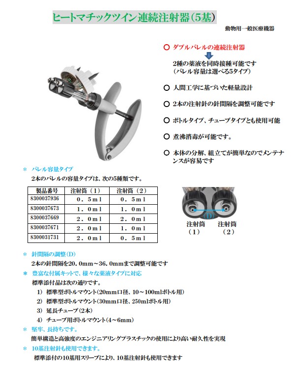 ヒートマチックツイン連続注射器 マルチアダプタータイプ 2025 11/03 プラスチック製連続注射器 注射器 2025年11月3日 ヒートマチックツイン連続注射器 マルチアダプタータイプについて 本商品の特徴 重さ 人間工学に基づいた軽量設計(プラスチック製) メンテナンスが簡単! 本体の分解、組立が容易。 煮沸消毒も可能 扱いやすい! ボトルバスケット使用で外部からの衝撃を防止 本製品の詳細 PDFデータはこちら 取り扱い店情報 プラスチック製連続注射器 注射器